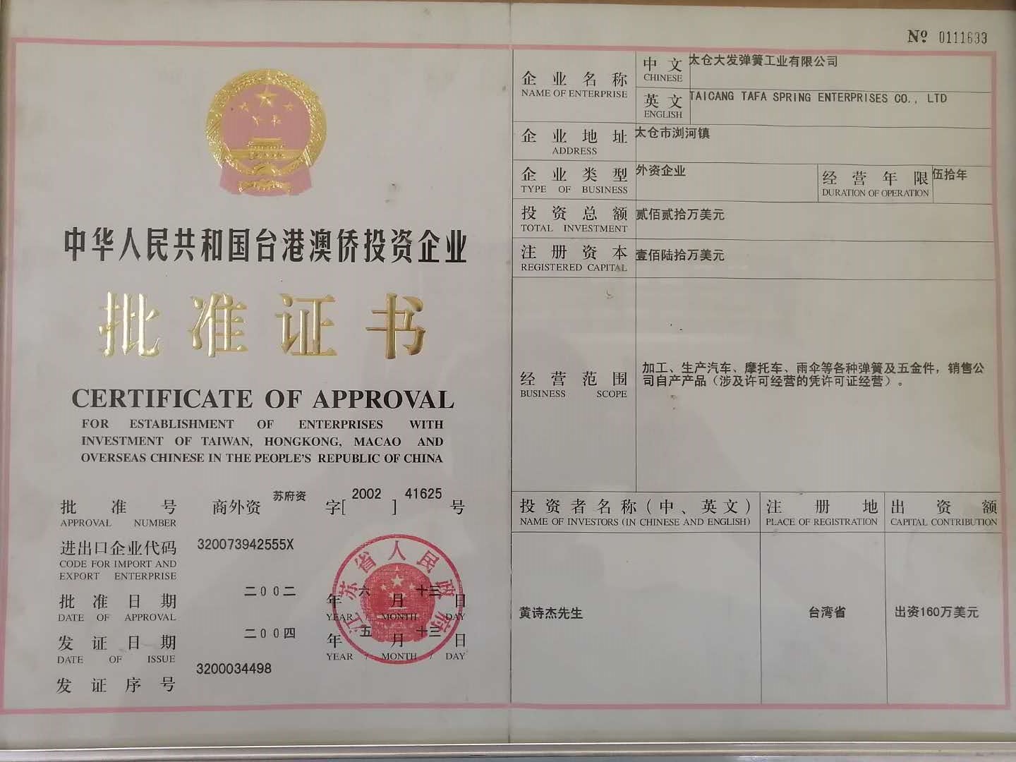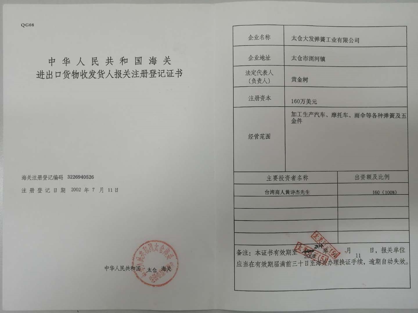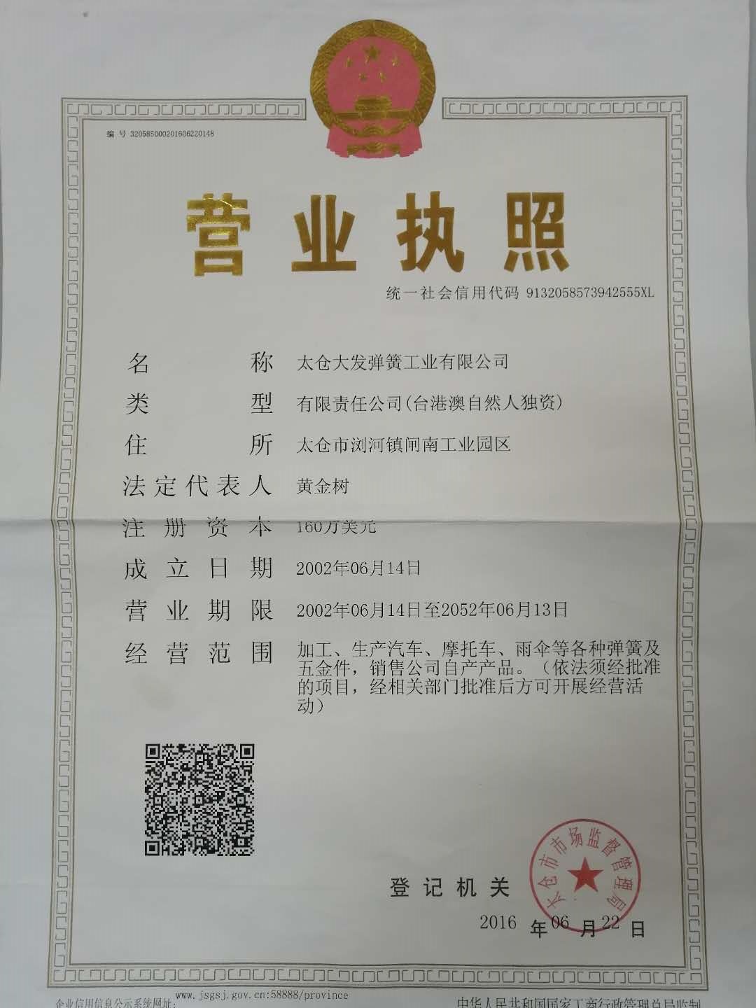 太倉大發(fā)彈簧工業有限公司由黃金樹先生于1967年始創(chuàng)于臺灣,是一個集雨傘、電子、五金機械、自行車、摩托車、汽車等的彈簧配件生產、加工、輔助設計服務的綜合性企業,其中1990年創(chuàng)辦的廈門大發(fā)彈簧公司、2000年創(chuàng)辦的深圳大發(fā)彈簧公司、2002年創(chuàng)辦的太倉大發(fā)彈簧公司均位于經濟發(fā)展地區,地理位置佳。我們憑借在彈簧制造業的多年豐富知識與技術,并著眼于以客戶為導向,秉持“以人為本,以質為先,以客為主,持續(xù)創(chuàng)新”的經營理念,強化競爭優(yōu)勢。公司導入ISO9001: 2000質量管理體系,執(zhí)行ISO14000:2000管理方式,倡導安全、高質量、高素質的生產。